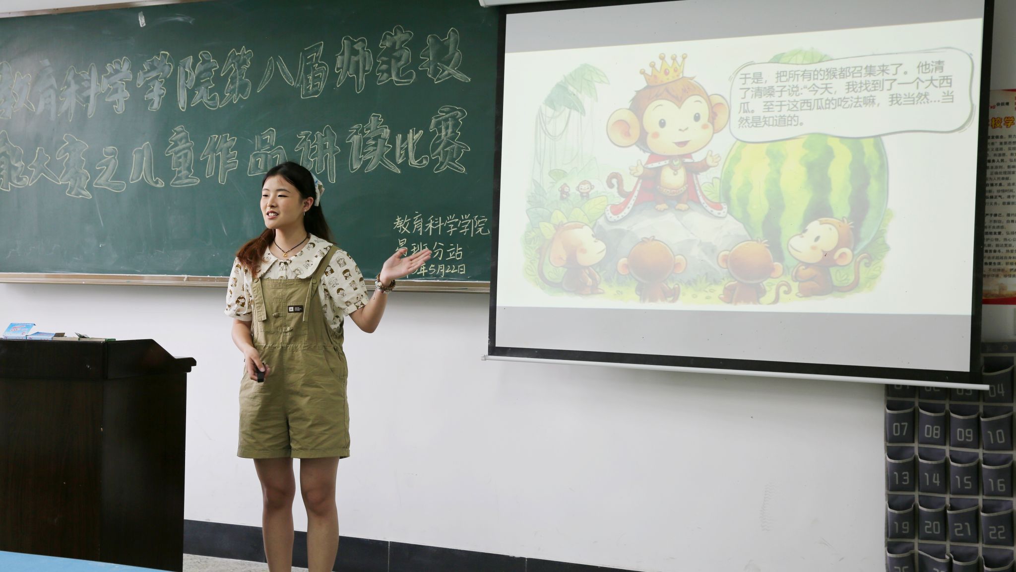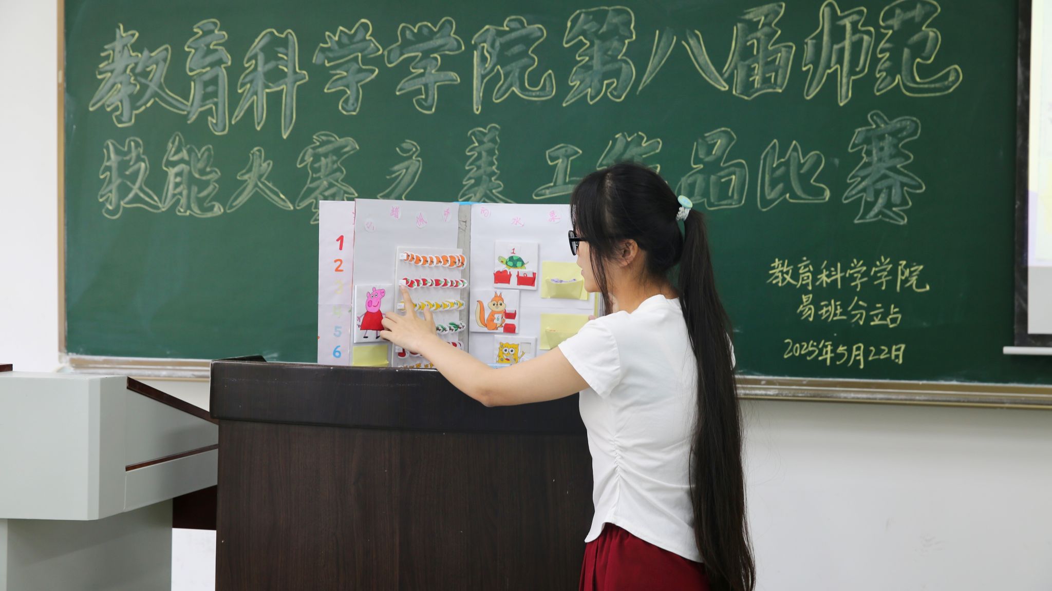 美工作品展示比赛如火如荼地进行。参赛作品类型丰富多样,涵盖剪贴画、手绘图书以及各类教学玩教具等。其中,吕玉莲同学的作品《数字乐园》以其独特的创意和实用的教学功能脱颖而出,荣获一等奖。该作品以数字认知为主题,通过六大板块分层递进的内容设计,逐步深化幼儿对数字概念的理解,帮助幼儿建立系统的数字认知体系,提升数感与逻辑思维能力。与此同时,儿童作品讲读比赛也吸引了众多选手。他们通过声情并茂的讲读,配合自制教具或课件,将一个个生动有趣的故事呈现给评委和观众。比赛现场,向林峰、桑尕吉和熊为三位同学带来的《皇帝的新衣》情景剧令人眼前一亮。他们迅速入戏,以极具张力的表演,将皇帝的骄矜、骗子的狡黠、孩童的天真刻画得惟妙惟肖。默契的配合与流畅的情节推进,让表演高潮迭起。这场充满创意的演绎,充分展现了选手扎实的功底与对舞台的热爱。简笔画创作比赛紧张而有序地进行。选手们在比赛开始前到达现场抽取题目,随后在规定时间内完成一幅简笔画,并围绕“课堂教学情境”进行创作,配合简笔画展示教学主题。大家都发挥创造力,画了精美有趣的画。其中,龚子涵同学以“端午节”为主题,画了一幅精美的中国地图,荣获三等奖;谢艺美同学同样以“端午节”为主题,创作了一幅极具创意和艺术感的作品,荣获二等奖。
