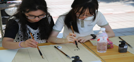 在书法体验区,同学们在学生志愿者的耐心指导下,提笔在斗方彩笺上书写名言佳句。他们神情专注,一笔一划都饱含着对书法艺术的热爱与敬畏。有的同学书写着古诗词,感受着古人笔下的诗意与情怀;有的同学则写下励志的话语,激励自己在未来的道路上勇往直前。墨香在空气中弥漫,笔墨韵味在彩笺上尽情展现。而在团扇创作区,更是热闹非凡。同学们手持画笔,在素雅的团扇上尽情挥洒创意。现场还有装饰精美的花朵、形态各异的面具等手工艺品展示,进一步增添了艺术氛围。同学们沉浸在传统绘画的乐趣中,欢声笑语不断。