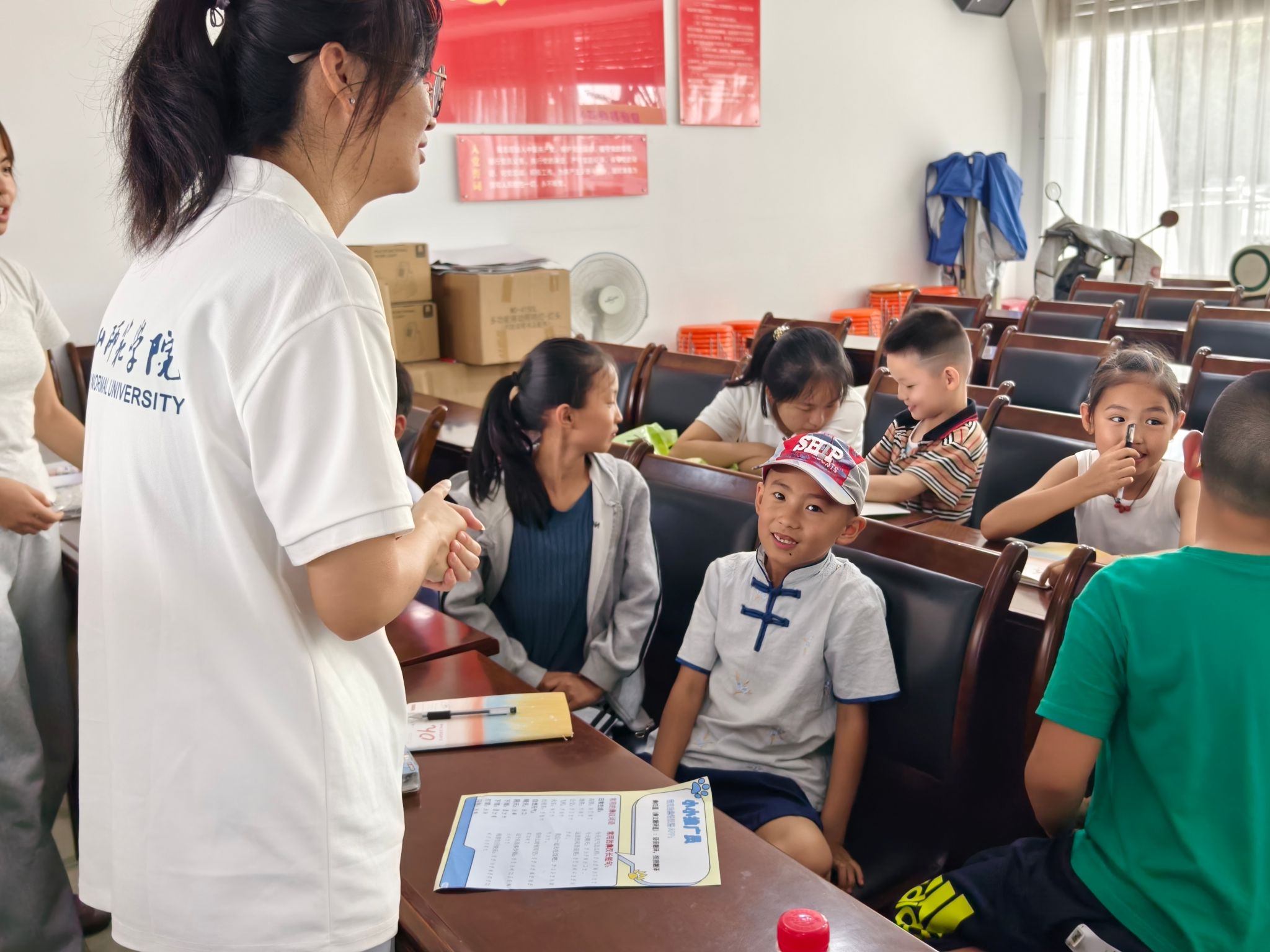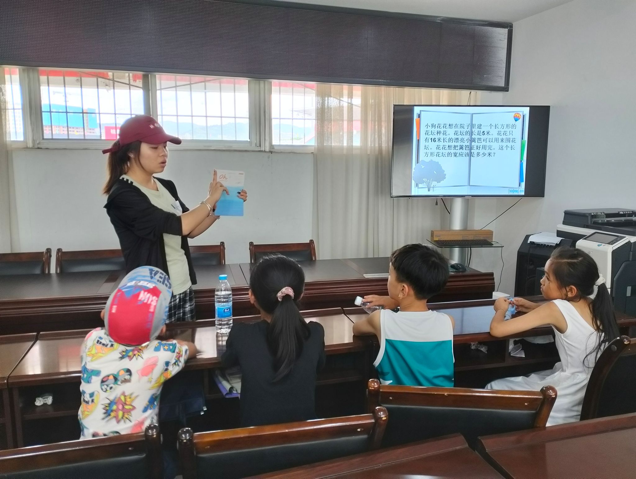 在“童音正韵·语润心田”普通话训练教学中,团队成员周虹呈先播放了准备好的标准普通话的朗诵音频和学习动画,孩子们瞬间被吸引,目光紧紧锁定在屏幕上。随后,讲授小老师逐字逐句示范朗读,耐心纠正孩子们普通话发音存在的错误。随后,谷安源、王欣雨两位小老师给大家进行了朗诵示范,抑扬顿挫的语调、饱含深情的演绎,让孩子们深刻感受到了文学作品的独特魅力。紧接着,孩子们在成员们的一对一指导下,逐句练习朗诵技巧,从语气的把握到情感的融入,孩子们用心揣摩、反复尝试。最终,每个孩子都勇敢地站在大家面前,自信满满地展示自己的朗诵成果。为传承中华优秀传统文化,增强社区青少年文化认同感,小老师以生动活泼的语言开启文化探秘之旅。通过趣味讲解,中秋节圆月寄托的团圆期盼、重阳节登高插茱萸的美好寓意等知识,像神奇的钥匙般打开了孩子们的文化好奇心。在“妙算思维工坊”课堂中,实践队员设计了兼具趣味与难度的数学思维题,孩子们围坐思考,时而皱眉沉思、时而豁然开朗。在小老师们的引导下,孩子们突破常规思路,尝试逆向推导等方法,在解题过程中锻炼逻辑思维能力。这些活动不仅丰富了孩子们的暑期生活,还在轻松愉悦的氛围中提升了他们的语言表达能力、思维能力和创造力。
