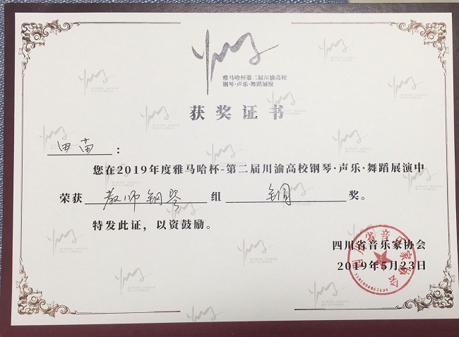 本网讯(文、图/廖华平)5月20至23日,由四川省音乐家协会主办的“雅马哈杯”第二届川渝高校钢琴·声乐·舞蹈展演在内江师范学院举行,来自川渝两地21所高校的三百余名师生参与了本次展演。我校教育科学院青年教师田苗代表pbw必威西汉姆联参加了教师钢琴组的比赛并获得铜奖。