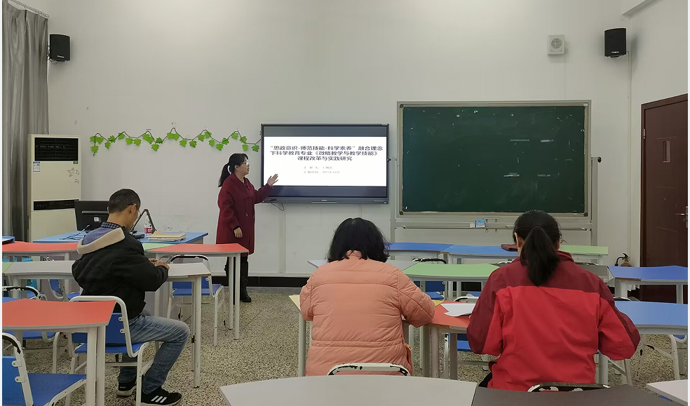 会上,本年度校级“融合发展”教学改革项目示范课程《“思政意识-师范技能-科学素养”融合理念下科学教育专业《微格教学与教学技能》课程改革与实践研究》负责人王朝君分别从研究背景、研究目标、研究路径、研究意义、计划与预算等方面汇报了项目的开题报告。
