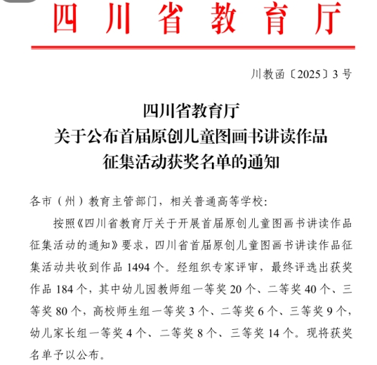 本网讯(文/贾琪 、图/陈秋役)2025年1月6日,由四川省教育厅主办的首届原创儿童图画书讲读征集活动发来获奖通知,betway西汉姆学前教育专业学生陈秋役在该活动中脱颖而出,斩获佳绩,荣获高校师生组赛道二等奖。
