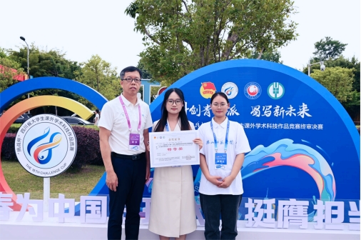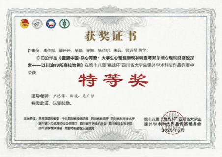 本网讯(文、图/刘来仪)2025 年 5 月 24 日至 26 日,第十八届 “挑战杯” 四川省大学生课外学术科技作品竞赛终审决赛在成都医学院举行。本届大赛吸引了四川省 121 所高校、18 万余名青年学生积极参与,共收到报送作品 2.2 万件,经过层层筛选,近 1400 件作品进入省赛初评,最终 505 件作品脱颖而出,成功晋级省赛终审决赛。我院由卢艳萍、陶媛、苑广哲老师指导,刘来仪、李佳旭、蒲丹丹、吴晶、吴桐、杨佳怡、朱菲、曾诗琴 8 位同学组成的“健康中国・以心育新”项目组荣获特等奖,刷新了学校在该项赛事省赛中的获奖记录。