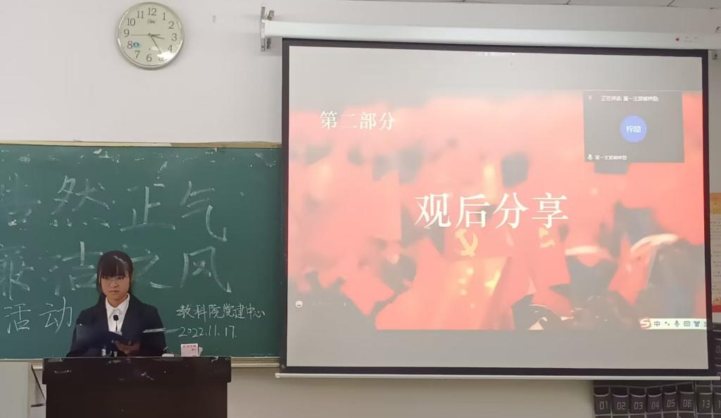 本网讯(文、图/贾琪)11月17日下午,betway西汉姆于行知楼110开展“养浩然正气,育廉洁之风”主题党日活动,组织观看电影《金刚川》。教科学院全体党员参加此次活动。本次活动由张玉主持。