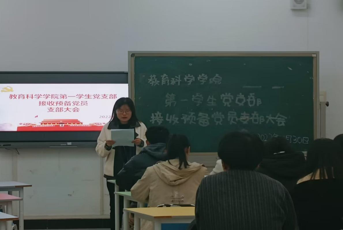 会议在庄严肃穆的国歌中拉开序幕。大会讨论了关于张慧美、缑月娇和朱俊妍3名发展对象接收成为预备党员的问题。首先张慧美、缑月娇和朱俊妍3名发展对象从现实表现、入党动机等方面汇报了自身情况。紧接着由入党介绍人分别介绍几位发展对象的考察情况并表明对其接收的态度,并由学生党支部书记代表支部委员会宣读支部考察结论。在参会党员充分讨论后,正式党员进行无记名投票表决,一致通过接收张慧美、缑月娇和朱俊妍3名发展对象成为中共预备党员。