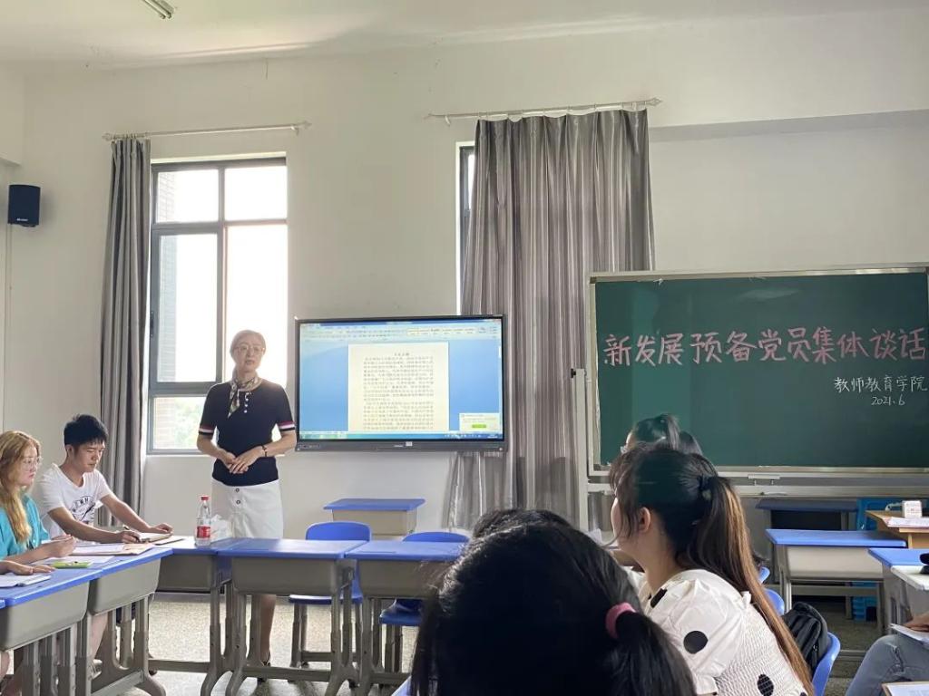 本网讯(文、图/党建中心)为提高发展对象对党章的认识和思想觉悟,端正预备党员的入党动机,培养支部新鲜血液,6月15日下午,学校上级委任组织员杨霞在学院301教室与新发展预备党员进行党史教育。教师教育学院64名发展对象参加了本次活动。