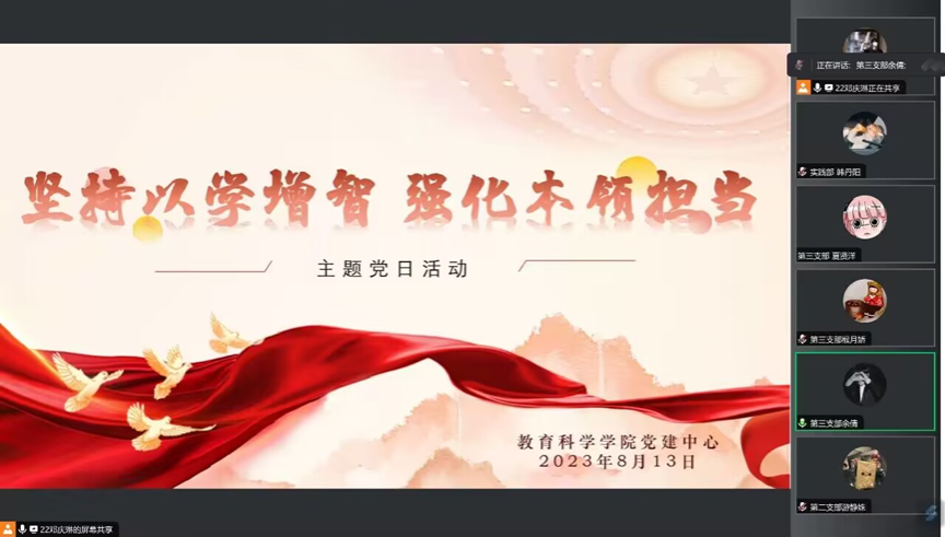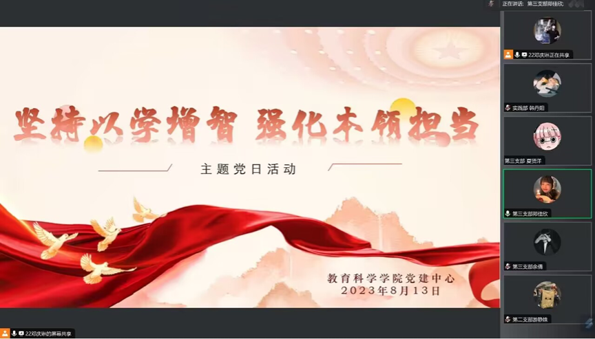 本网讯(文/沙忠梅、图/韩丹阳)8月17日下午,betway西汉姆学生以线上会议的形式组织第三学生党支部全体党员开展了“坚持以学增智,强化本领担当”主题党日活动,此次活动由邓庆琳主持。