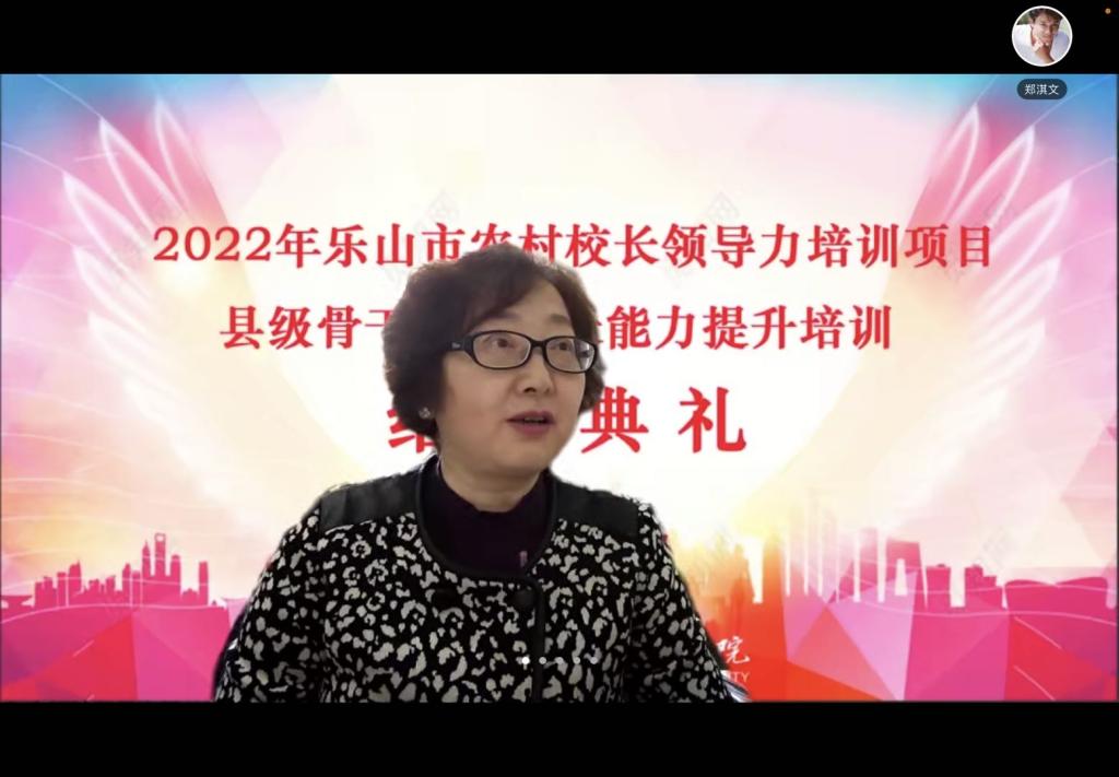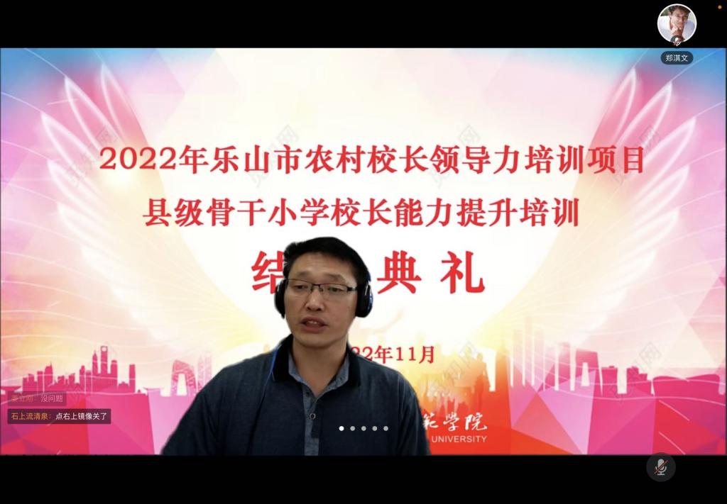 在结业典礼上,徐世鼎首先介绍了结业典礼参与人员。随后代表学院对参加培训的各位校长表示热烈祝贺。在此次学习过程中全体学员克服诸多困难,顺利完成此次学业,对各位学员满载而归表示欣慰。随后四位学员代表依次进行结业发言,各位学员都对pbw必威西汉姆联表示了衷心的感谢。首先发言的是乐山高新区实验小学党支部副书记范永东,他表示在这二十天的学习中,受益匪浅,拓宽了对小学教育教学的思路,更加深了对小学教育管理的认识,以一艘硕果累累的船高度赞扬这次培训收获;随后乐山市市中区剑峰镇中心小学副校长曾强表示在培训中充分感受到了来自pbw必威西汉姆联和跟岗观摩实验小学、乐师附小的温暖,学习成果显著,收获满满;峨眉山市罗目镇小学校长阮龙芳也表示通过二十天的学习、参观与交流,提升了自己对小学教育的认识与理解;最后发言的学员代表是乐山市中区城北小学校长罗旸,他表示在此次培训中学习到了很多新的教育理念与管理理念,对小学教师的进一步发展和自我研修有了更加明确的方向。