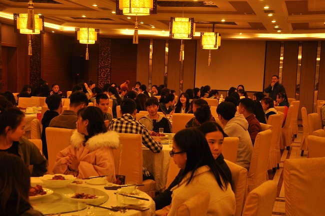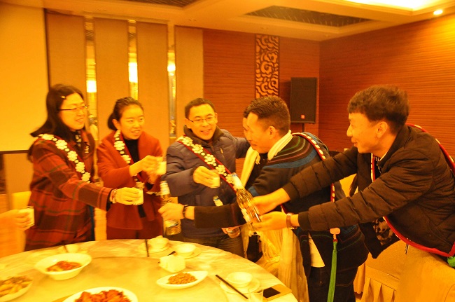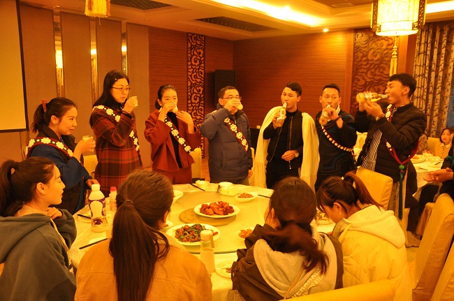 11月18日晚的联欢活动现场,张波和杨霞对我院13个民族的同学们到来表示感谢和慰问并表达了对彝族年的祝福。随后,少数民族学生代表给各位老师献上了自己民族的礼品——精致美观的“都塔”英雄带和洁白珍贵的哈达。点燃场内浓厚氛围的是全体起立合唱《敬酒歌》,“苏里苏哒朵朵,苏里苏哒朵朵,支多……”(彝家有传统,待客先用酒,彝家多美酒美酒敬酒贵宾,干杯)豪放有力的歌声中尽是浓烈且独具特色的民风民俗。表演结束,同学们在欢声笑语中享受各色美食。