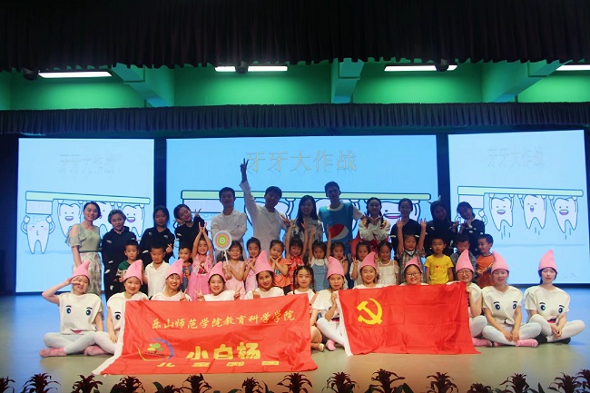 据悉,此次"六一"前夕的系列活动,教科学子不仅将志愿服务意识融入日常活动,更是将专业特色融入日常活动。30-31日,教科学子在教科学院党总支书记杨霞、副书记张波、学前党支部书记张涛、专任教师唐姝倩、王春燕和李非易带队下,跟随着乐芽艺术团及小白杨儿童剧团,分别前往乐山市机关幼儿园、艺术幼儿园、乐师附小等多所学校,先后进行了儿童剧《牙牙大作战》、《十二生肖之拯救老虎》的表演,活泼的语言配上形象的动作,整个舞台富有生趣,跃跳之间尽展教科学子专业技能,儿童亦是随表演的发展变化神情,轻松之余,引发了小朋友们对“刷牙”、“保护动物”等多种思考。同时,身着“乐芽”绿的教科志愿者,在学前党支部书记张涛的带领下,前往市机关幼儿园协助各班老师给小朋友们梳头、涂口红,帮助小朋友们上妆;在县小排练;在乐师附小的“六一”游园活动中进行班级管理……乐芽志愿者们在具体志愿服务中提升自我服务意识,以实际行动传达志愿情怀。