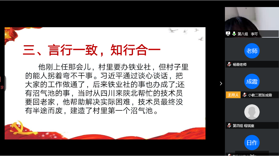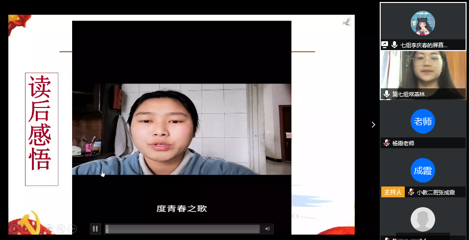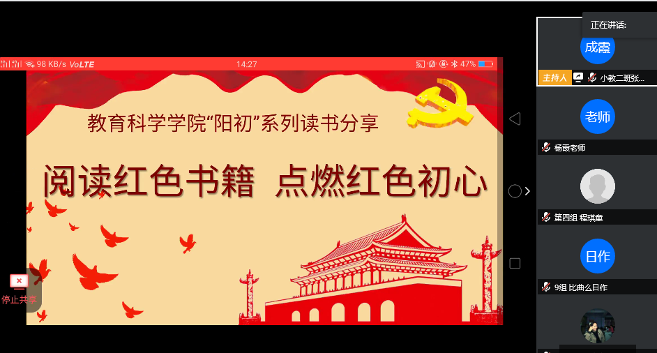 本网讯(图、文/魏逍)4月27日晚上7点,教科学院在腾讯会议上举行第四十一期入党积极分子“阳初——阅读红色书籍·点燃红色初心”主题红书分享会,参加本次活动的有教科学院分党校校长杨霞、分党校班主任魏逍以及第四十一期全体入党积极分子。活动由党建中心的张成霞主持。