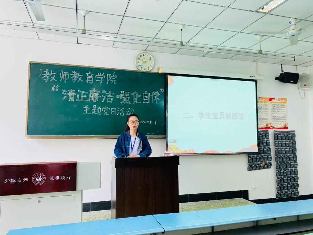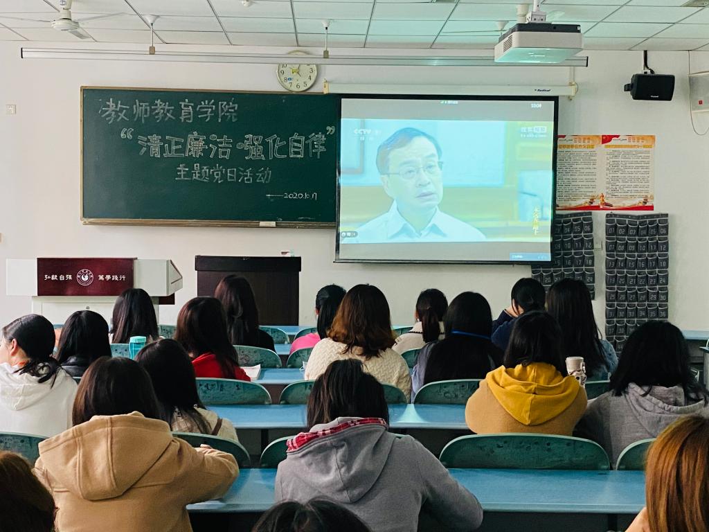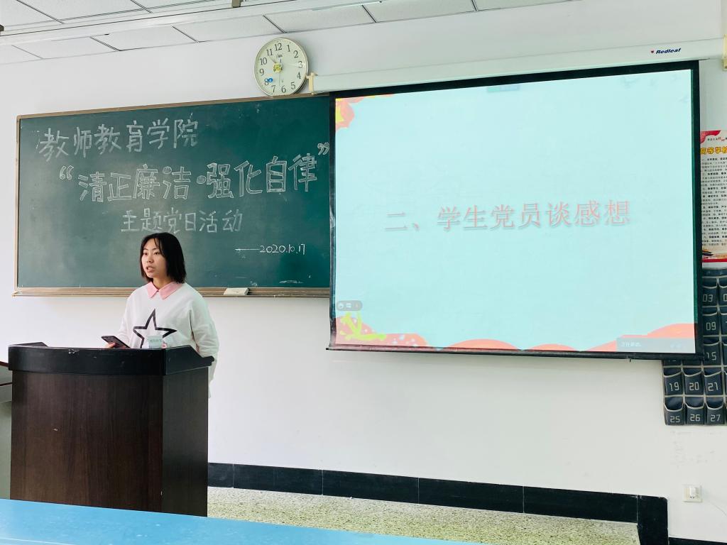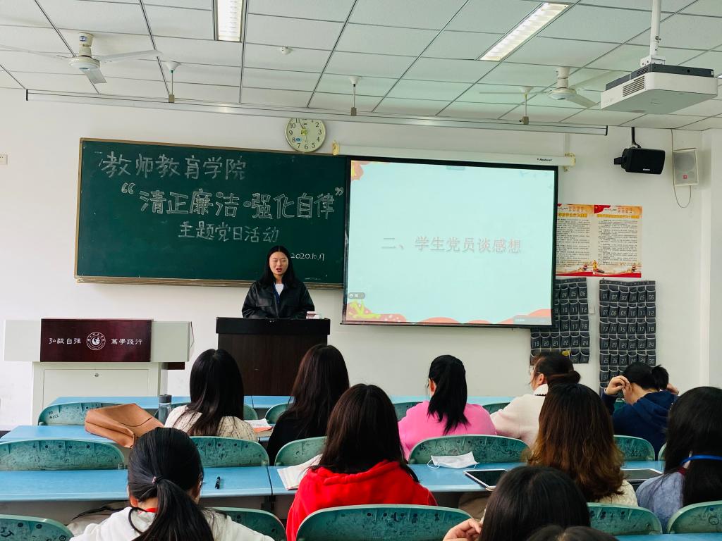 本网讯(图、文/常燕林)为贯彻党的十九大精神及习近平新时代中国特色社会主义思想,强化学生党员政治担当,增强“讲政治、业务精、作风好”的党员干部意识,教师教育学院学生党支部于10月17日上午10:00,在行知楼206教室开展“学四史,清正廉洁,强化自律”主题党日活动,全体学生党员参加活动,会议由王淇主持。