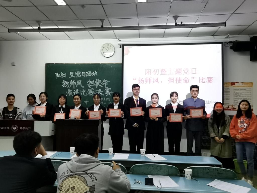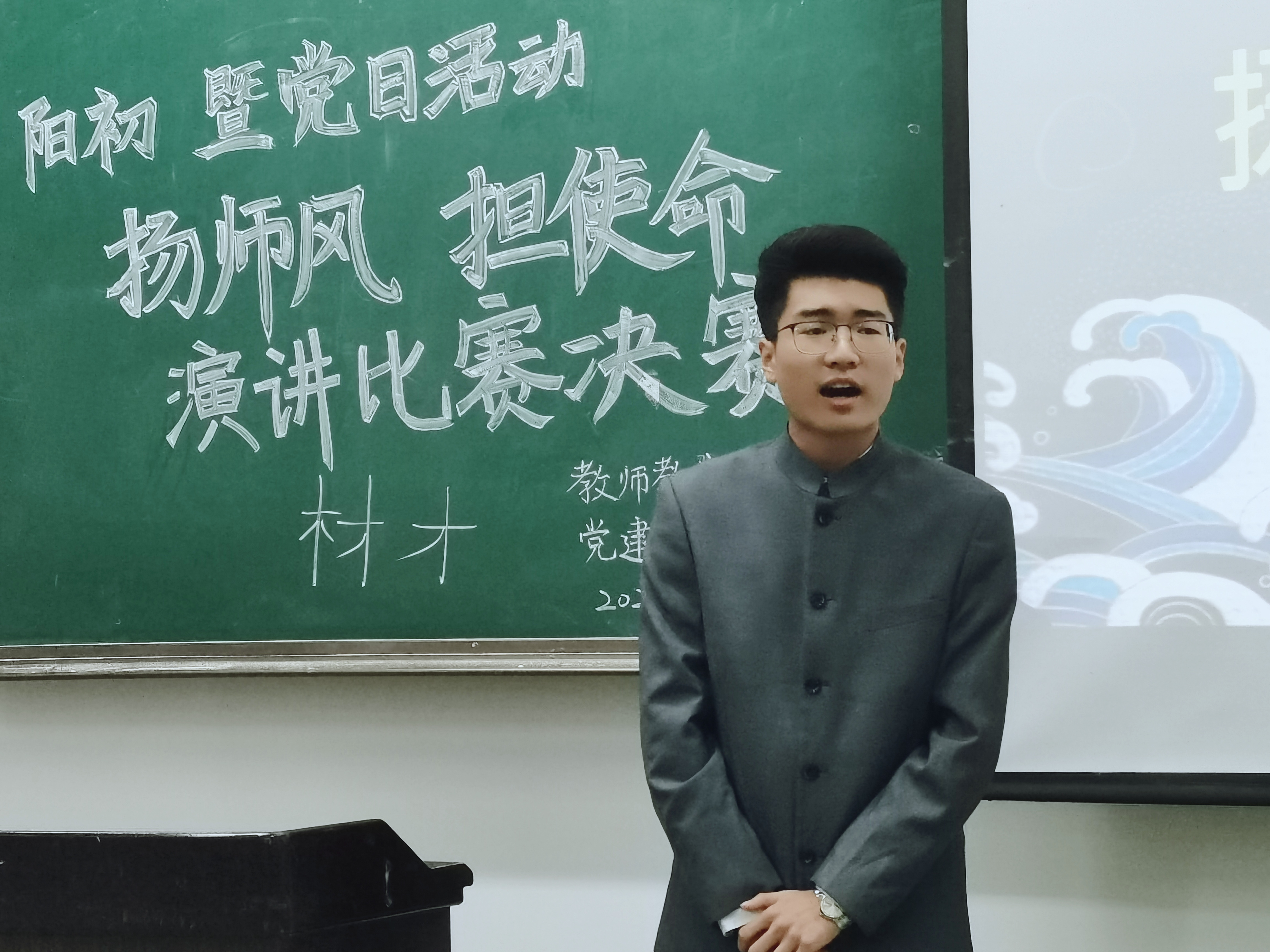 本网讯(图/党建中心、文/刘玉蝶、王雪)为弘扬师德师风,展示有担当、能担当的未来教师风采。11月21日上午9:00,教师教育学院学生党支部在行知楼开展“扬师风,担使命”演讲比赛决赛曁主题党日活动。活动由王佳鑫主持,全体学生党员参与。