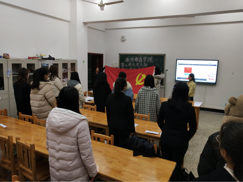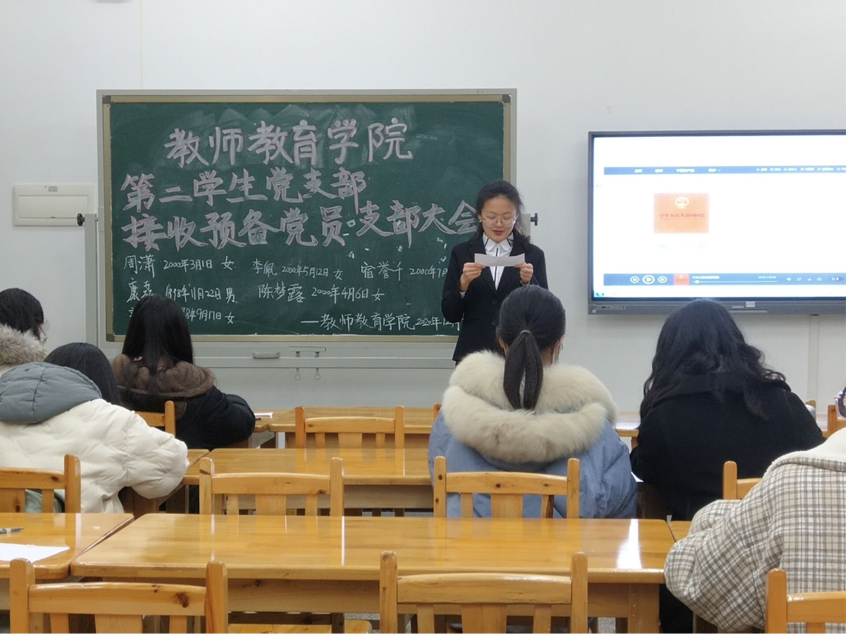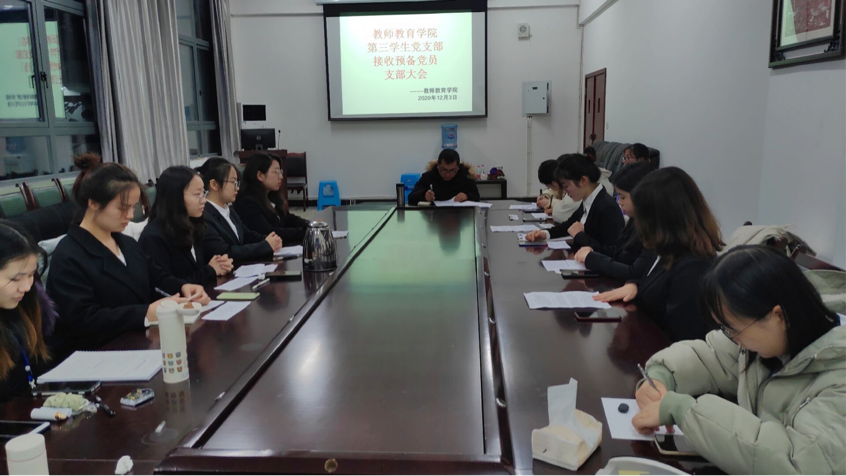 本网讯(图、文/王雪、陈颖)12月3日晚上19:00,教师教育学院三个学生党支部分别在特教学院B幢101、102、306教室召开支部大会讨论接收预备党员。参会人员有第一学生党支部书记翟雅媛,第二学生党支部书记杨婷婷,第三学生党支部书记袁立方以及全体学生党员。会议由各学生党支部书记主持。