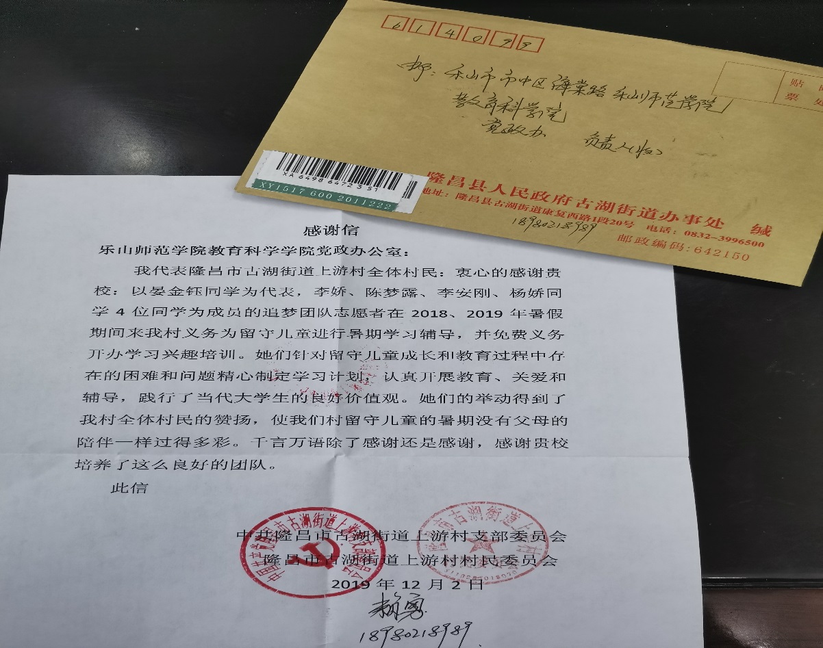 本网讯(文/艾洁、图/艾洁)12月30日,pbw必威西汉姆联教师教育学院收到一封来自隆昌市古湖街道上游村支部委员会和隆昌市古湖街道上游村村民委员会联名发来的感谢信,高度赞扬我院晏金钰为代表,李娇、陈梦露、李安刚、杨娇同学4位同学为成员的追梦团队志愿者在2018、2019年暑假期间驻上游村为留守儿童进行暑期学习辅导并免费义务开办学习兴趣培训的行为,称赞她们践行了当代大学生的良好价值观,使上游村留守儿童的暑期没有父母的陪伴一样过得多彩。在来信的信末深切地表达谢意:感谢贵校培养了这么良好的团队。