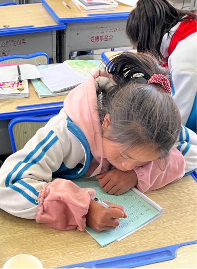 山区孩子们的求知欲望都非常强烈。最让我印象深刻的是二年级小朋友们,我作为他们的书法老师第一次去他们班上课时,他们告诉我说以前的美术课、书法课、音乐课等都没有老师给他们上。他们还想学习英语,但奈何二年级还没有开设英语课,于是我决定把他们的课堂变得多元一些,将他们想学习的知识都融入我的课程中,这样才能满足小小的孩子们那强烈的求知欲,让他们学到更多。