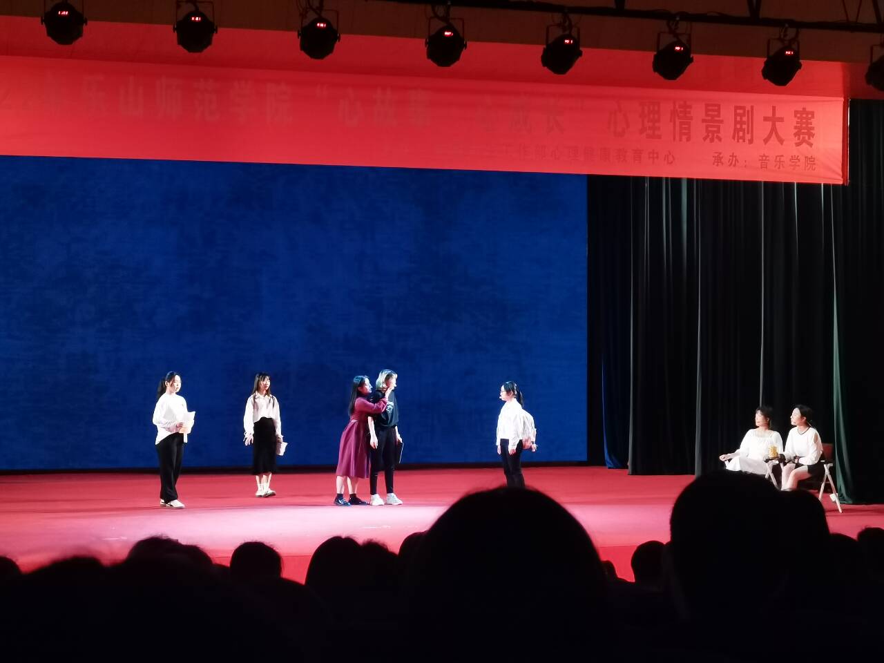 三个团队在比赛前认真准备排演,编写剧本、选择演绎人物、组建团队和舞美安排,都为呈现出较佳的心理情景剧展示效果,表达心理情景故事的意涵。当天比赛舞台上,演绎者们突出人物间的矛盾,注重与观众的心理链接,横跨地理空间、室外室内、生活状态、时间维度的场景布局,以及精彩的角色独白、对白、旁白、情绪表达,都呈现出了唯美的心理情景剧效果。在《未完待续冂中人》的演绎中,邓卷卷在内卷浪潮中,看到身边的人都在向前跑,每个人都催着她跑,可她不知何去何从,最终她从躲避走向面对的心路历程。卷卷的故事启示学生:每个人的人生是属于自己的主角戏,谁都当不了自己人生中的旁观者,不内卷不是躺平,我们要明确目标地向前跑,要明白“我们所期盼之事即是我们所前往之处”。在《天光》中,兰兰在经历歧视、控制、抑郁症等折磨后,想要了解自己时,守回了最亲爱的外公,在这部剧中的兰兰有力的诠释遭遇折磨时,要坚定自我,勇敢面对,坚强撑过去才有可能守得云开见月明,要始终相信风雨过后定会有阳光。《以爱之名》中,乔安好从小到大被妈妈以爱的名义控制、束缚着,以后的安好也用爱的名义控制男友和室友们,在她看来,她所做一起的出发点都是因为爱对方,但爱绝不是打着以爱为名的控制,我们应该及时明白以爱为名的控制不是爱,打破这样的心理枷锁,与自己和解,学会坦诚爱自己也爱别人。在表演的每一个剧中都能看到学生在面对生活的影子,这是同学们的精彩呈现,也是心里情景剧的独到之处。
