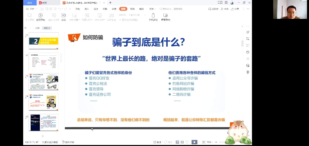 新生反诈骗教育由朱志刚老师从什么是电信诈骗、电信诈骗的高发类型、打击两卡犯罪、打击跨境犯罪和如何识别防范电信诈骗等五个方面进行相关的教育讲解。他通过往年新生的诈骗案例,让萌新们了解到诈骗无时不在,要加强防范心,他告诫同学们世界上最长的路绝对是骗子的套路,骗子们会以各种身份,各种方式进行诈骗,一定不能掉以轻心。