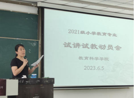 会议伊始,由小学教育专业姜立刚老师发表讲话,首先从试讲试教动员大会的意义出发,结合小学教育专业人才培养方案,明确了试讲试教的实践性教学课程地位;其次,结合学校和学院对试讲试教的工作要求,强调了小学教育专业师范生试讲试教工作的重点,主要集中于教学设计、教学实施等基本教学实践能力的训练;最后,强调了考核与评价问题,明确要求各位同学严格按照学校与学院要求开展各项训练任务,及时提交线上与线下考核材料,确保试讲学习目标顺利达成。大会结束后,各小组同学积极与指导老师取得联系,为后续整体推进试讲试教工作提早做好具体规划与各项准备。本次动员大会,使同学们更深入地了解了小学教育专业的人才培养方案,也让同学们感受到了试讲试教工作的重要性,希望同学们能够积极投入到试讲试教过程中,从中学有所获,为进一步成长为小学骨干教师的培养目标奠定基础。