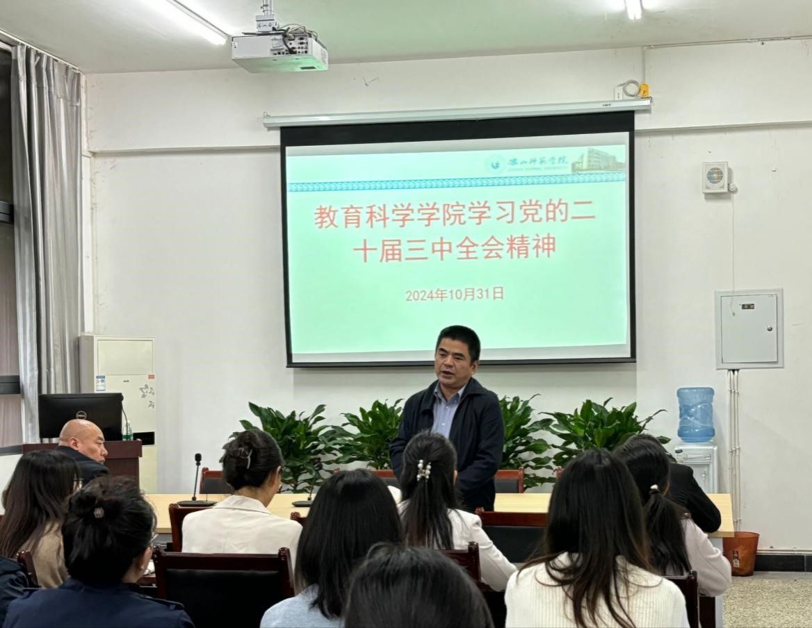 本网讯(文/吴光耀、桂超,图/牛林源)为深入学习贯彻党的二十届三中全会精神,10月31日,betway西汉姆在特教B栋101会议室开展了党的二十届三中全会精神学习宣讲会。马克思主义学院雍滨瑜老师到会宣讲,学院全体党员老师和部分学生党员代表参会,学院党委书记罗立顺主持会议。