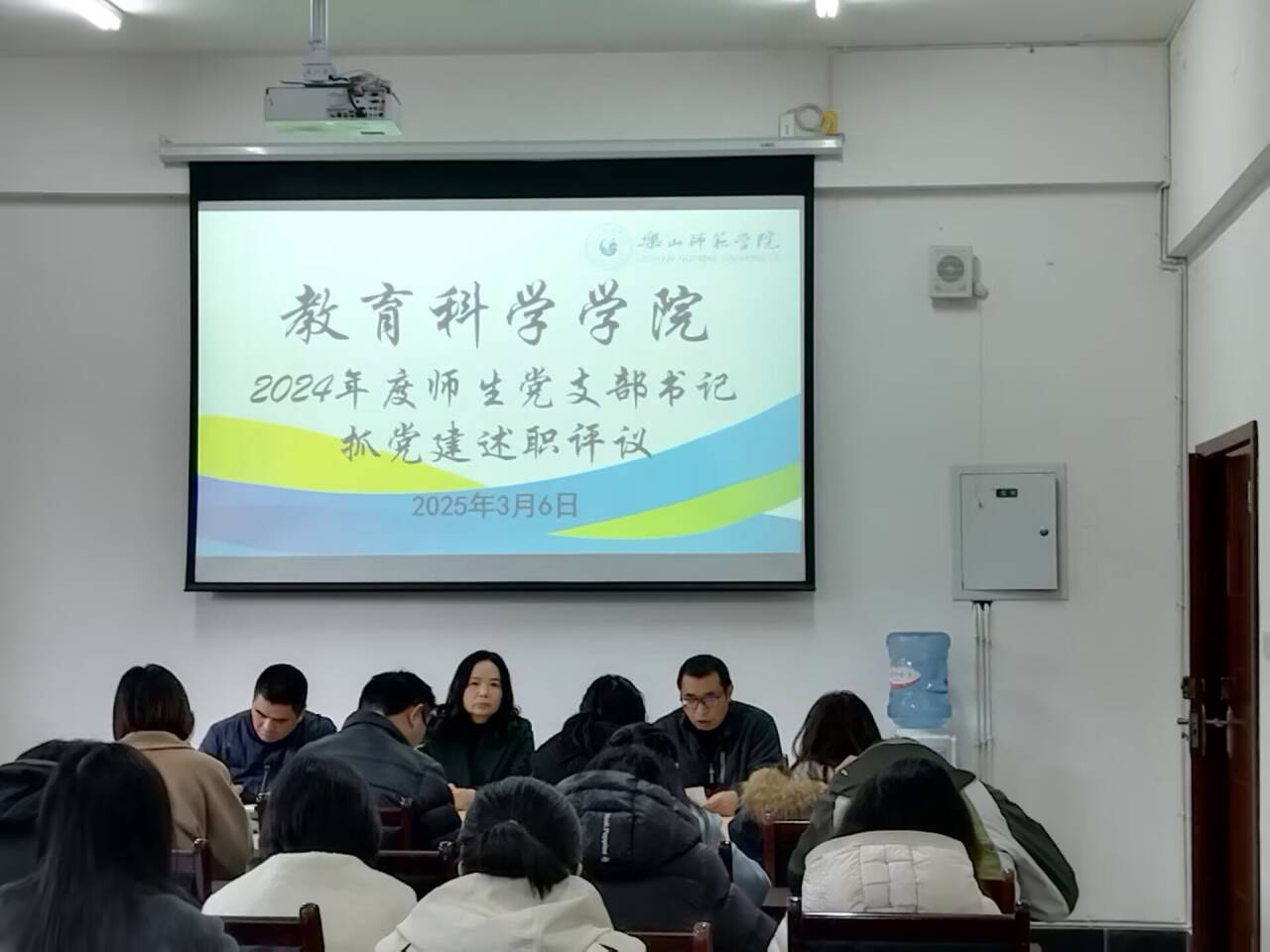 罗立顺主持各支部书记依次展开述职,教职工第一、第二党支部围绕教职工党建工作和教学科研工作,汇报了基层党支部的建设情况和党员教师学习、工作的主要情况。第一教职工党支部书记廖华平讲到,2024年支部为学院各项重要工作提供坚实的政治保障和组织支持,成立了“小学教育专业硕士点建设党员攻坚队”、“师范专业认证党员先锋岗”,支部党员教师积极充当“主力军”,推动工作顺利进行。第二教职工党支部书记王立新讲到,在党建引领下,支部教师在教学科研和学科竞赛指导方面都取得了显著成果,支部党员教师全年共成功申报省部级项目2项、市厅级项目多项,并指导心理学专业学生在“挑战杯”比赛、全国心理与行为在线实验精英赛等赛事中荣获佳绩。同时,在峨眉一中、乐山一中、草堂高中等学校多次开展心理健康教育方面的地方服务工作。教职工党支部也分析了一年工作中存在的不足,并深入思考了改进方向。第一、第二、第三学生党支部汇报了学生党支部在学生党员培养和发展、基层党组织建设、党日活动开展、学生党员思想政治教育等方面的工作。第一学生党支部书记杨蕾讲到,2024年支部切实加强党员管理,在发展党员工作中严格把好“入口关”,做好入党积极分子培训工作,加强对预备党员的培养和考察,以提高学生党员队伍的素质。第二学生党支部书记童瑶提到,支部将在新一年工作中继续做好党建工作深入服务学生,创新党建工作方式,形成党建工作品牌,着力推动支部建设全面进步、全面过硬。第三学生党支部书记朱志刚谈到,2024年支部始终围绕着党建促团建、团建促学风的工作思路,扎实推进学生党员的思想政治教育,不断增强学生党员的先进性和纯洁性。