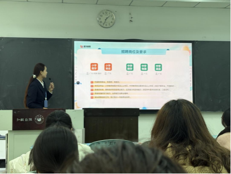 活动现场,爱华教育招聘负责人结合自身从业经历,细致讲解了企业的发展历程、核心业务布局,重点介绍了此次招聘的学前教育指导、课程研发、教务管理等岗位详情,包括岗位职责、任职要求、薪资构成及职业晋升通道,让同学们对岗位需求有了清晰认知。针对毕业生普遍关心的岗前培训、职业发展前景、薪资福利等问题,企业代表逐一耐心回应,现场交流氛围活跃。宣讲结束后,毕业生们有序投递简历,与招聘人员面对面沟通,主动参加试讲展示专业能力和实践经历,充分展现出良好的精神风貌和扎实的专业功底。