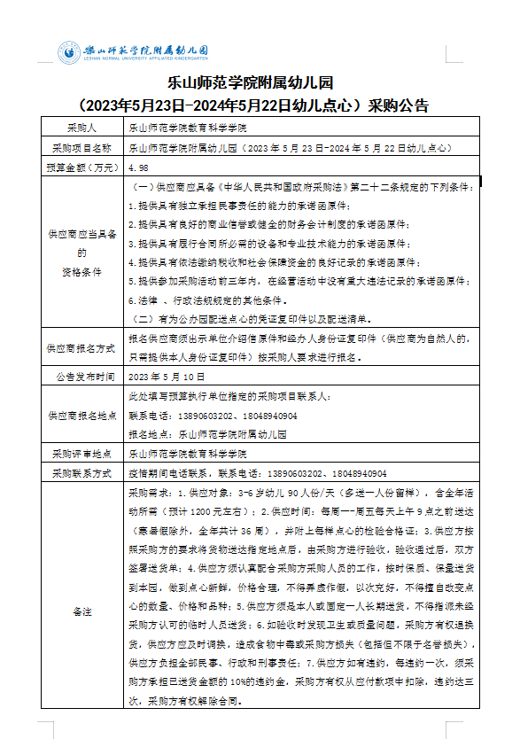 pbw必威西汉姆联附属幼儿园(2023年5月23日-2024年5月22日幼儿点心)采购公告
