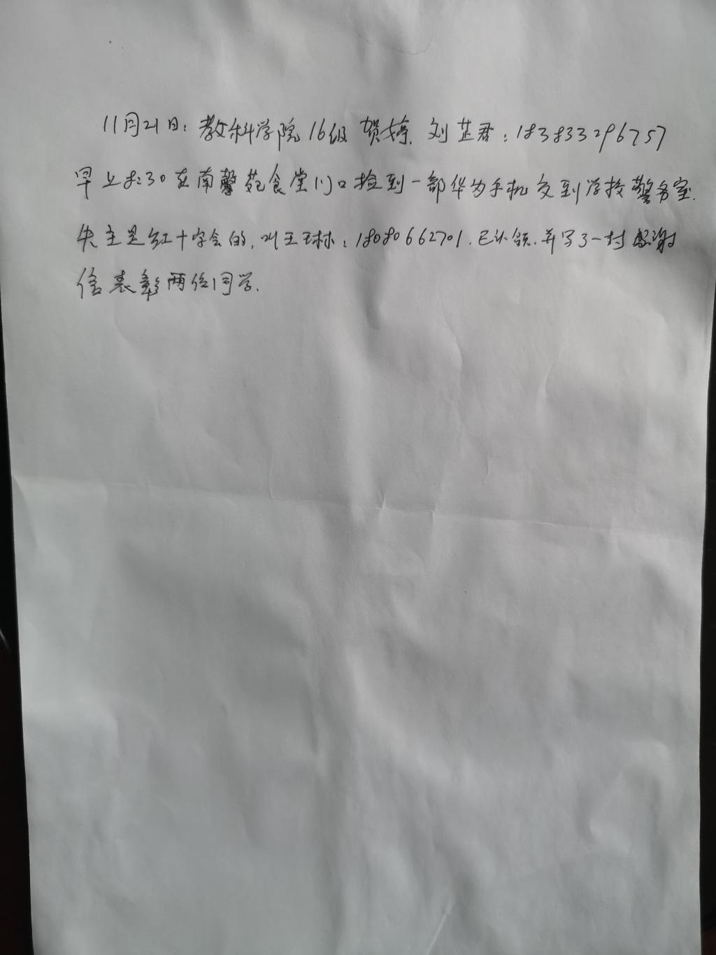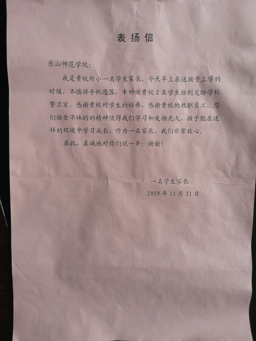 本网讯(文、图/罗祺平)11月21日早上,乐师附小一位家长在送孩子上学时,不慎将自己的华为手机遗落,被教科学院16级的贺婷、刘芷君拾到,及时交到学校警卫处,让失主找到自己的手机,挽回了损失。失主写了一封感谢信交给学校,为他们拾金不昧的品格点赞;感谢学校培养出这样品格优秀的学生,并说道让自己的孩子在这样的学习环境中学习很放心,这样的精神值得发扬光大。