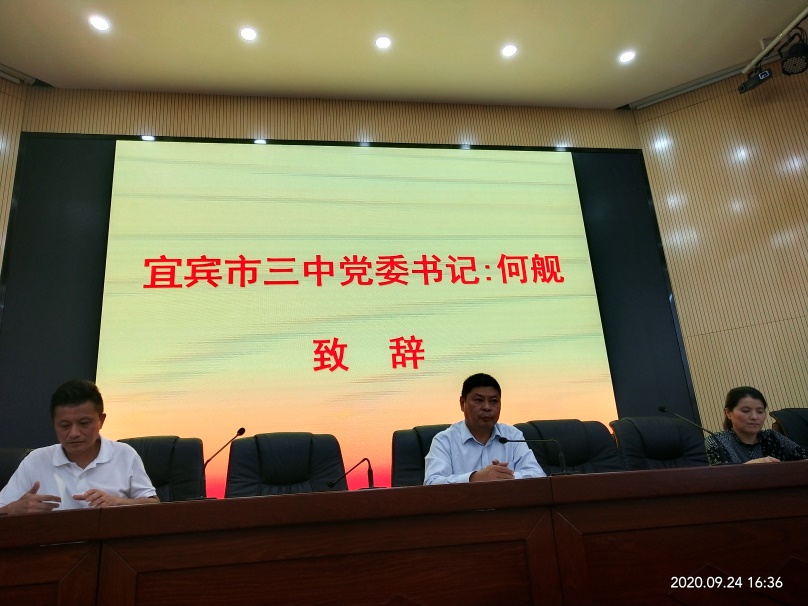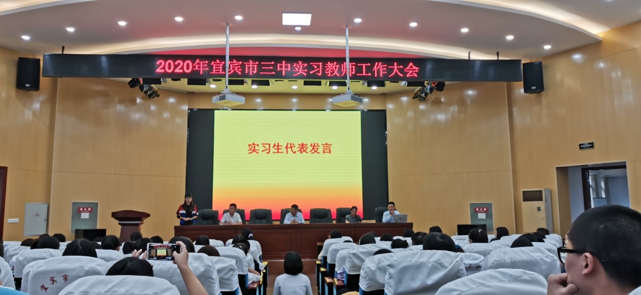 下午四点二十,宜宾市第三中学举行了2020年宜宾市三中教师工作大会,大会中,宜宾三中党委书记何舰老师对我们到校实习表明热烈欢迎,同时对我们的实习工作提出一些建议和意见,比如我们该如何备课,如何讲题等等,并且对我们人身安全予以关心。