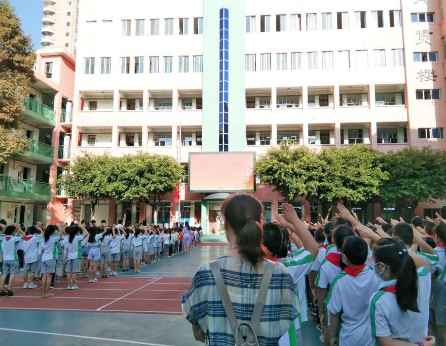 每周周一升国旗,全校师生都立正站直,学生右手举过头顶,庄严面向国旗,唱国歌,在《义勇军进行曲》的歌声中,感谢先烈们为今日和平安定的生活做出的贡献,感谢国家为今日和谐的社会做的努力。