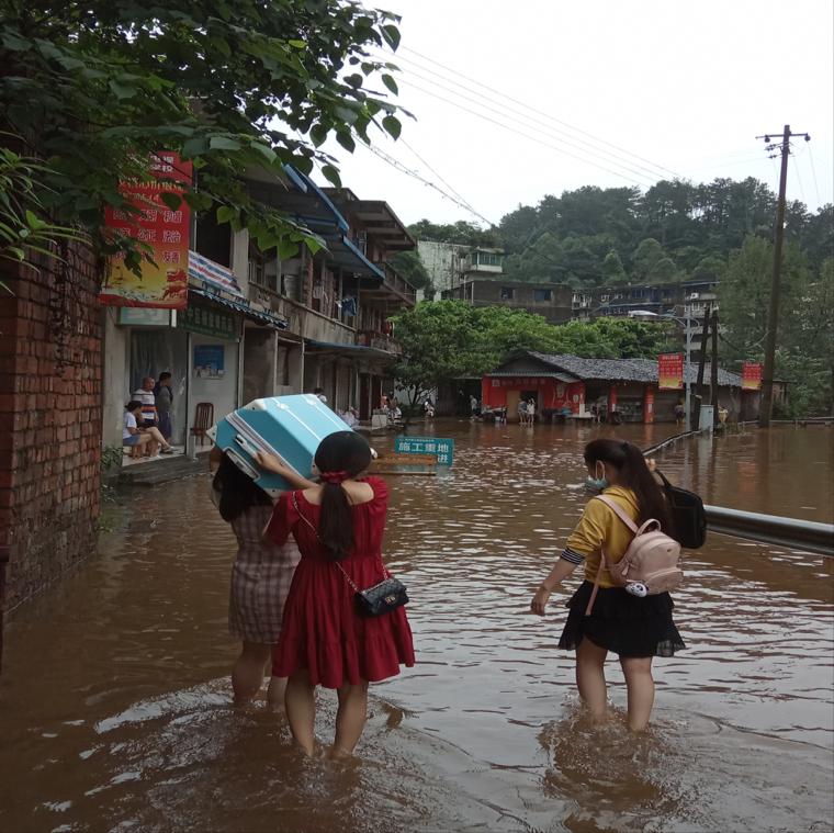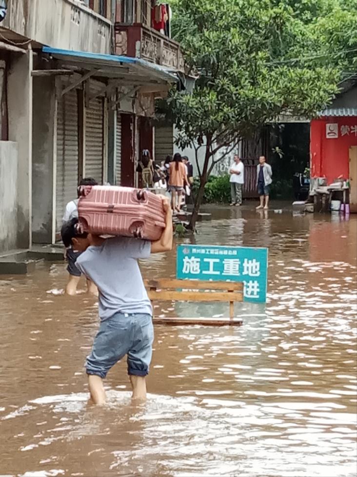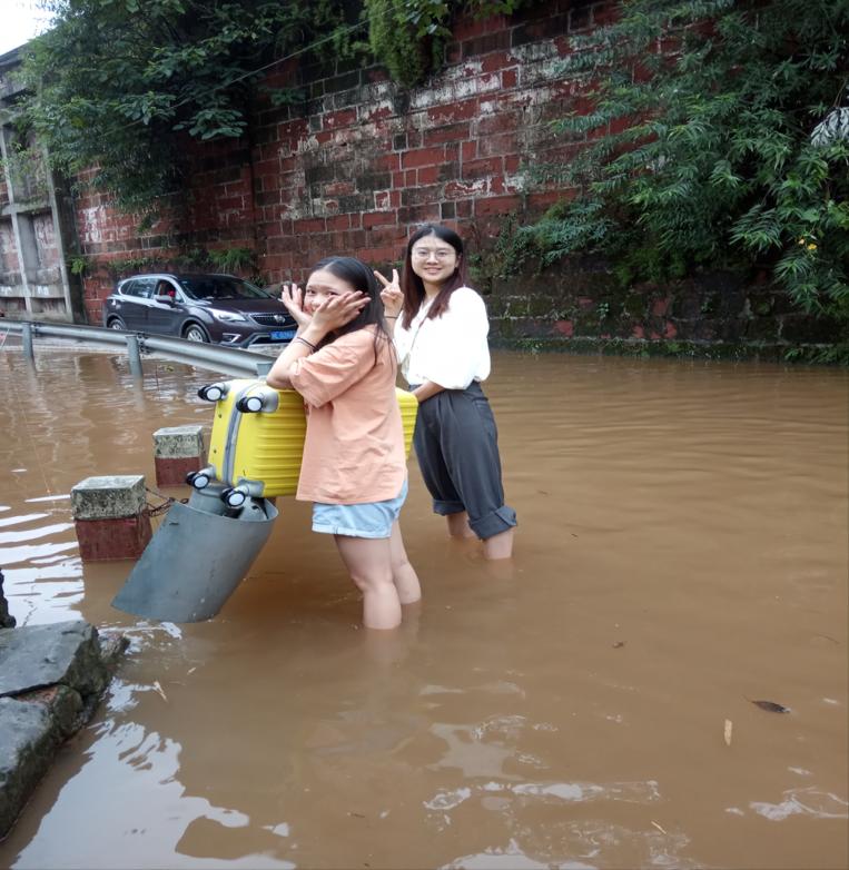 8月17日上午,pbw必威西汉姆联旅游学院10名实习生怀揣着教育实习的热情,在带队老师郑柳青的带领下,前往乐山广播电视中等专业学校报到。暴雨洪水阻挡不了师生们前进的步伐,虽然通往实习学校的道路,由于河水倒灌,淹没至膝盖,车辆均无法通行,但是师生们迎难而上,将沉重的行李扛在肩上,在洪水中逆水前行,坚持按时上岗报到。