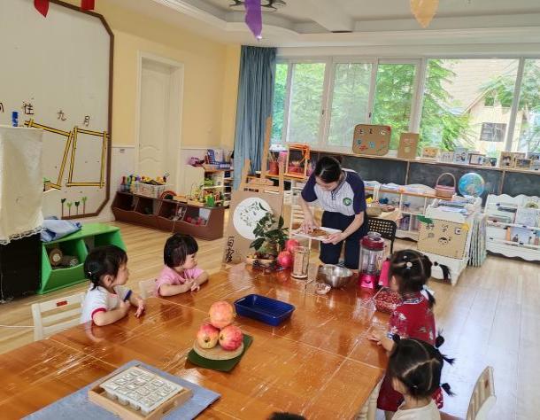 在节气日当天,艾乐幼儿园F3班组织了很多有趣的活动,品茶,采摘桂花做桂花蜜,小朋友自己带石榴来,亲手剥石榴,榨汁带回家和爸爸妈妈分享,品尝水果:香蕉、桂圆、地瓜干……在活动开展的过程中,小朋友们都积极参与,乐在其中,体验白露节气的气息。