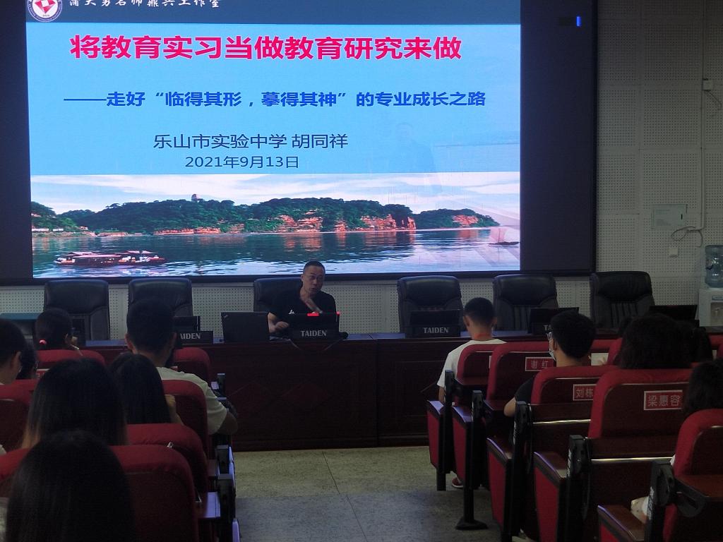 本网讯(文、图/杨建辉)9月13日,pbw必威西汉姆联67名同学前往乐山实验中学报道实习。该校领导非常重视本次实习工作,除严格进行常规的防疫工作检查外,特别安排做好实习第一课。首先由四川省骨干教师、特级教师、正高级教师胡同祥老师做关于“临得其形,摹得其神”的专题讲座。胡老师通过我校优秀教育实习学生的实习过程回顾,实习心得体会,实习情感倾述,从教育实习内涵、为何实习、实习为何、如何做好实习四个方面引领学生认识实习的价值,理解实习的内容,感悟实习的方法。接着乐山实验中学的校长、四川省骨干教师、特级教师、正高级教师汪伟介绍了实验中学的现状,特别是学校教学优势、教学特色与师资力量,鼓励实习生认真实习,深入实习,比较交流性实习,实践反思性实习。并现身说法,从观课的技术、备课的技术、教学组织、教学反思等细节方面指导学生抓好细节,重视交流,亲力亲为,反思成长。
