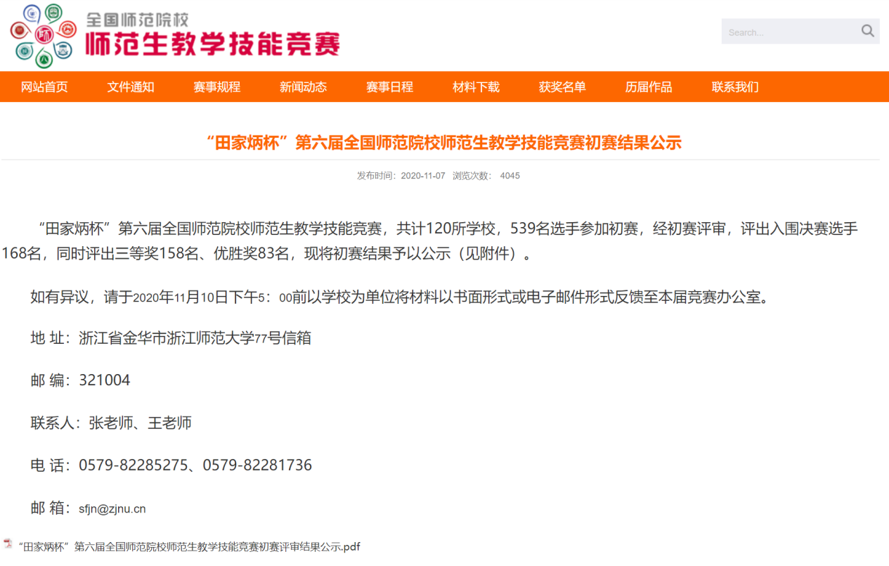 本网讯(文、图/杨小丽)11月7日,由浙江师范大学承办的全国师范生教学技能竞赛(简称“国赛”)初赛结果公示,我校6名选手在全国120所高校539名选手中脱颖而出,其中5名选手入选决赛,1名选手获得优胜奖。