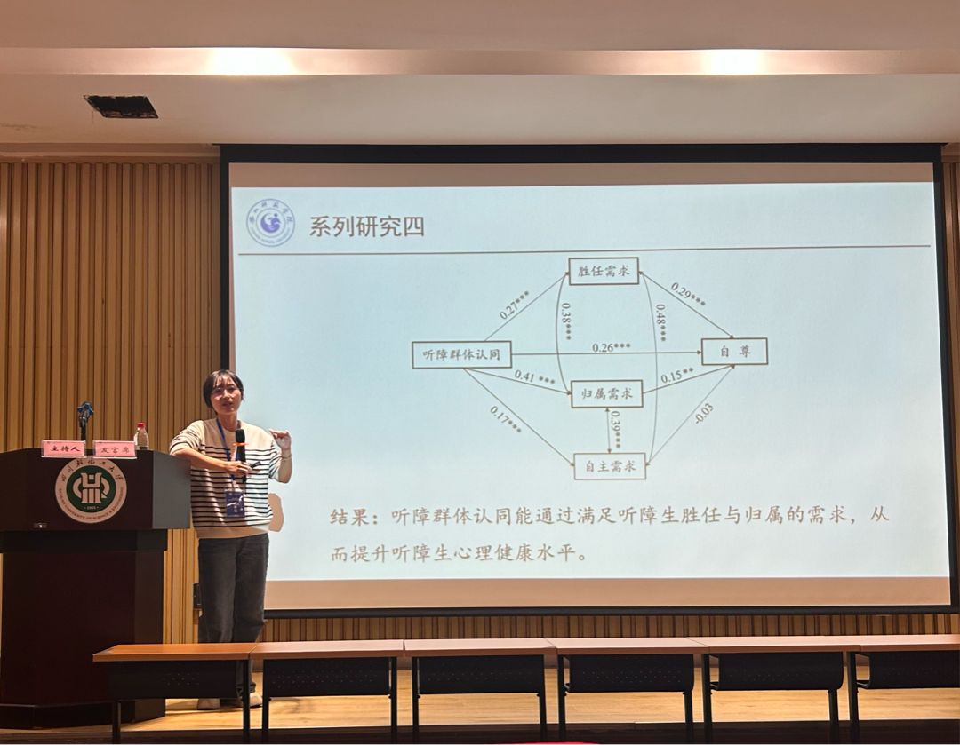 马艺丹作了题为《群体认同与听障生心理健康促进》的报告,她从公共卫生层面点明了关爱残疾学生心理健康在当下的重要性;并从实证的角度阐述了听障生心理健康的促进路径,既体现出科学严谨的研究方法,也展示了对特殊群体的人文关怀。