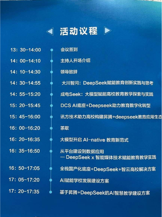 这次研讨会的主题是:AI算力底座与大模型赋能教育场景创新,主要内容包括四川高校智能教育实践案例分享、昇腾 AI+DeepSeek 教育解决方案主题演讲、DeepSeek、智谱等大模型在教育场景应用展示与研讨等三大模块,同时,十多家川内外教育信息化企业在会场周围布置了大量展台,动态形象地展示了他们对于AI赋能教育创新落地化的系列化产品。